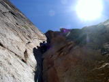 一向にビレイポイントが現れない。登っていても、これがホントに5,5か?と疑いたくなるようなクラックだ。体感的には5,9くらいに感じる。やっぱ調子悪いのかな・・・。自分に自信がもてない状態では、客観的な判断さえ難しかった。ロープ一杯、やっとの思いでビレイポイントと思しきところにたどり着くと、そこにあったのは、ハンガーボルトではなく、ピナクルにぐるりと巻かれた古いスリングだけだった。ビレイポイントを見過ごしてきてしまった!!しかしここからではクライムダウンもままならず、カムで補強してビレイポイントを作った。妻がフォローしてくる間、一生懸命ルートを探す。すると、すぐ上に、1本ボルトが打たれている。やっぱりここで間違いないんだ。ほっとした。